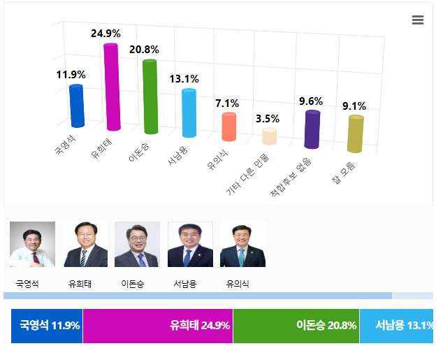 ¿ÏÁÖ±º¼öÈĺ¸¼±ÅñâÁØ¿¡¼ "ÇàÁ¤ÅëÇÕ¹®Á¦Çذá"Àº ¡¸À¯ÈñÅ¡¹22.7% > ¡¸À̵·½Â¡¹19.9% > ¡¸±¹¿µ¼®¡¹14.9% , "ÁöÁöÁ¤´ç°øÃµ"Àº ¡¸À̵·½Â¡¹34.9% > ¡¸À¯ÈñÅ¡¹18.6% > ¡¸¼³²¿ë¡¹17.9% , "ÁֹμÒÅë°úÈÇÕ"Àº ¡¸À¯ÈñÅ¡¹28.4% > ¡¸À̵·½Â¡¹19.6% > ¡¸¼³²¿ë¡¹14.6% , "°ø¾àÁ¤Ã¥½Çõ"Àº ¡¸À¯ÈñÅ¡¹30.3% > ¡¸À̵·½Â¡¹16.2% > ¡¸±¹¿µ¼®¡¹13.4% ¼øÀ¸·Î ÁöÁö¸¦ º¸¿´´Ù.